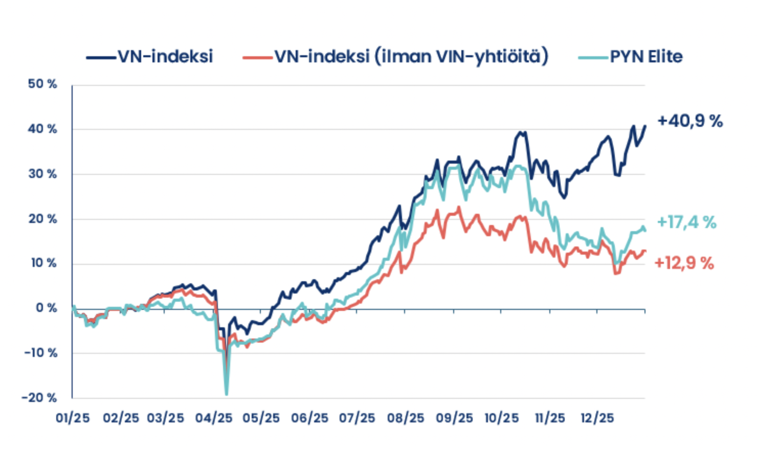 Pyn Elite Fund vừa có báo cáo hiệu suất năm 2025 trong đó nhấn mạnh chỉ số VN-Index của Sở Giao dịch Chứng khoán Việt Nam đã khép lại năm 2025 với mức tăng ấn tượng 40,9%, đánh dấu một trong những năm bùng nổ nhất của thị trường.